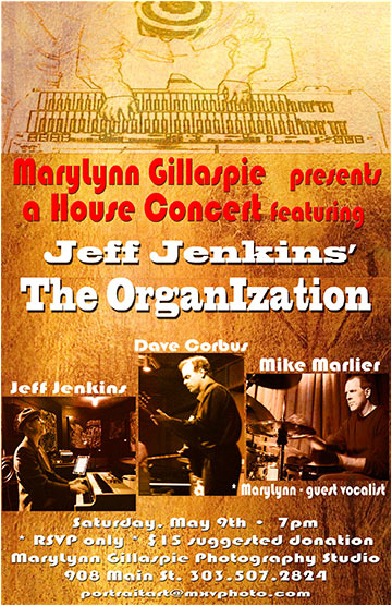 The 6th House Concert will feature Jeff Jenkins’ The Organization, with Jeff Jenkins on organ, Dave Corbis on guitar, Mike Marlier on drums, and the great vocals of MaryLynn. Seating is limited so early reservations are encouraged. 303-477-3730.