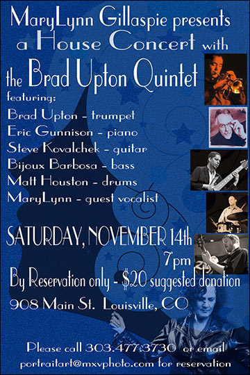 The next House Concert will be November 14 featuring the Brad Upton Quintet with Brad Upton, trumpet, Eric Gunnison, piano, Steve Kovalchek, guitar, Bijoux Barbosa, bass, Matt Houston, drums. Limited seating so RSVP early. Contact MaryLynn: 303.507.2824 or portraitart@mxvphoto.com