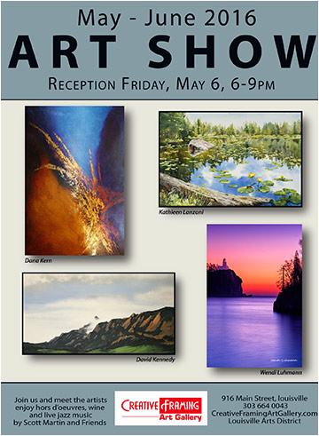 Featuring the works of Wendi Luhmann, Dana Kern, Kathleen Lanzoni and David Kennedy. Enjoy hors d-oeuvres, wine and live jazz by Scott Martin and Friends.