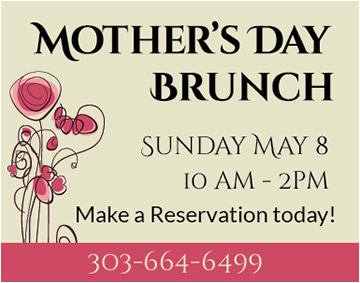 Take your mom out for our special brunch on Mother’s Day! Make your reservation now and call 303-664-6499.