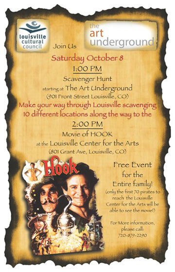 This is a joint collaboration between Louisville Cultural council and The Art Underground. The Scavenger Hunt kicks off at 1:00 pm at the Art Underground. Participants will go through a Louisville scavenge ring of 10 different locations along the way to the 2:00 pm film showing of HOOK at Louisville Center for the Arts. Only the first 70 pirates to reach the Arts Center will be able to see the movie! This is a free event for the entire family. www.artunder.org for further information