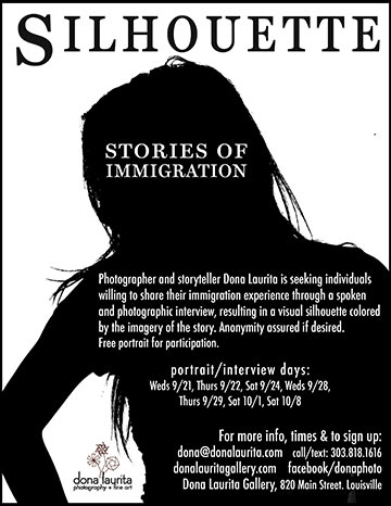 Do you have an immigration story to tell? Photographer and storyteller Dona Laurita is working on a compelling project that seeks individuals willing to share their stories through a spoken and photographic interview. The result will be a visual silhoutte colored by the imagery of the story. Free portrait for participating and participants can remain anonymous. Contact dona@donalaurtia.com or call 303-818-1616.