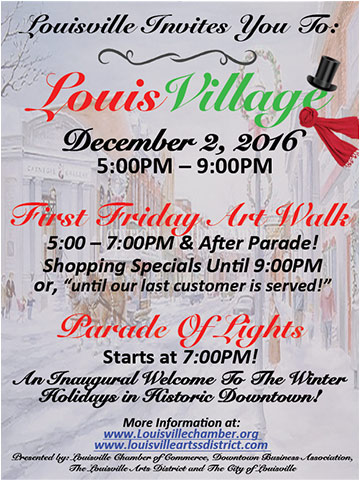 Ring in the Holiday Season with lots of holiday festivities combined with First Friday Art Walk and the Parade of Lights. Here are some of the great activities you can enjoy, brought to you by the Chamber of Commerce, the Downtown Business Association, City of Louisville and the Louisville Arts District: