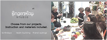 Yarn Parties at FingerPlay Studio add play to your office get together, friends night out or celebration. Choose from a list of projects suitable for anyone. Projects range from knitting to crochet to creative weaving and more. Materials and instruction are included. Book a party at your location or at FingerPlay Studio. Call Celeste or Carol at 303-604-4374.