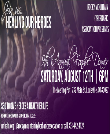 The Rocky Mountain Hyperbaric Association will holds its 9th Annual Fondue Dinner fundraiser at the Melting Pot. The event is designed to raise money to help the Healing our Heroes program and costs $60 per person. The Healing Our Heroes program supports veterans of Operation Enduring Freedom and Operation Iraqi Freedom, first responders and fire fighters with brain injuries by assisting with payments for hyperbaric oxygen therapy treatments as well as providing lodging for those veterans who will be traveling to Louisville for treatments. For further information or to register for the event, visit rmhabi.org or call 303-442-4124.